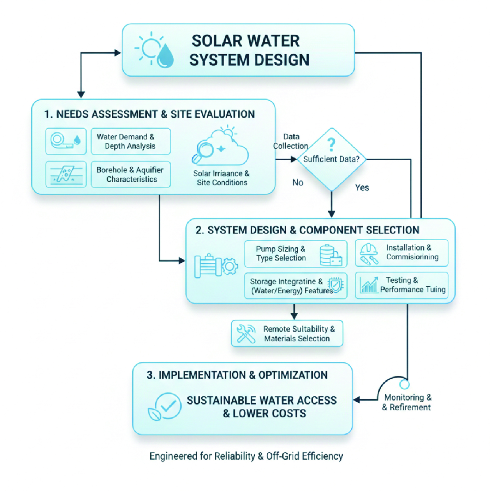Capabilities include pump sizing, borehole optimization, storage integration, and low-maintenance system design suitable for remote locations.